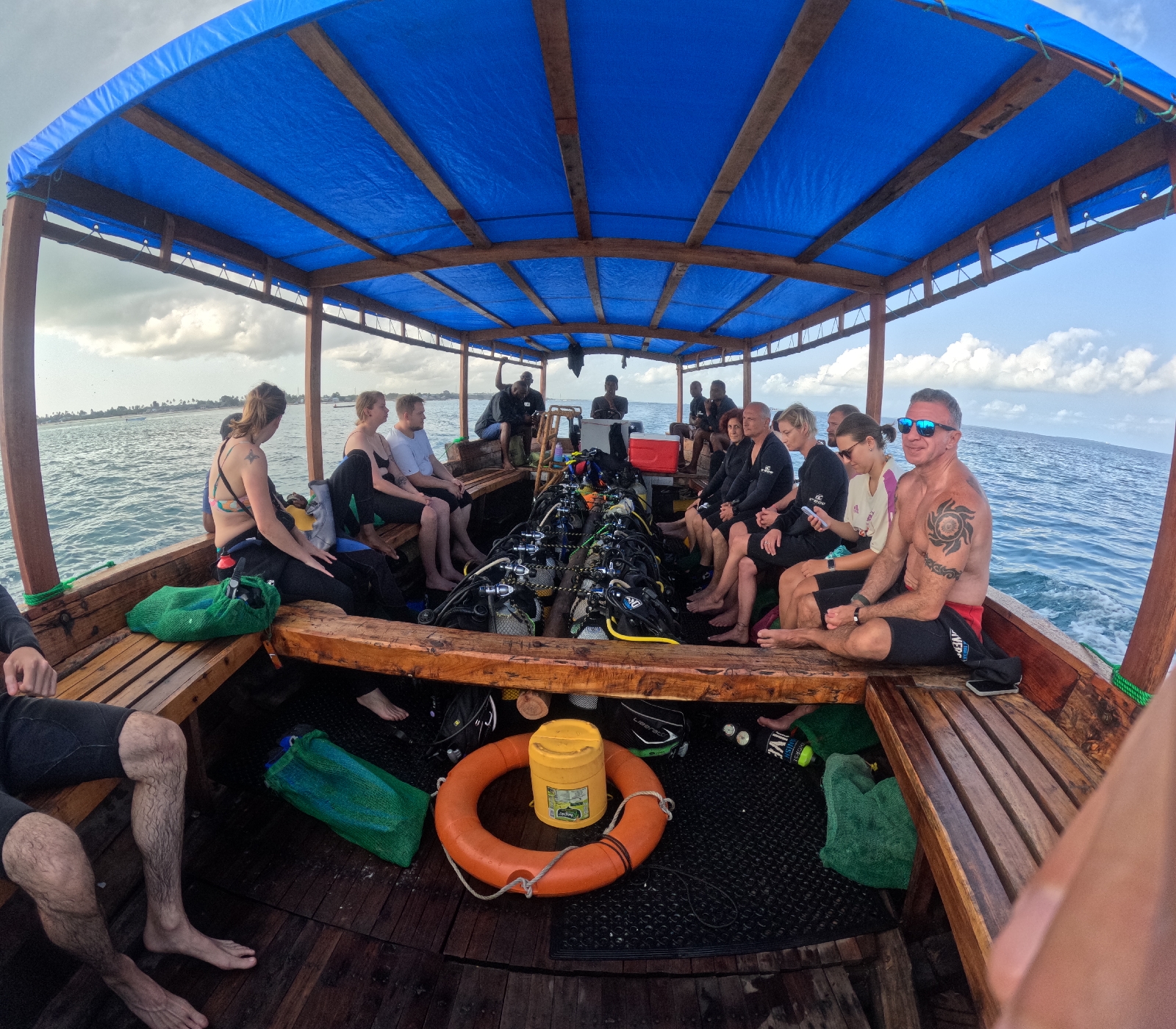 Dziś śniadanie było ok.7:30, ponieważ chwilę po 8 byłem w centrum nurkowym przy naszej plaży. Po przygotowaniu sprzętu wypłynęliśmy w kierunku wyspy Mnemba. Na łódce było ok. 15 nurkujących, plus ok. 5 osób z obsługi. Towarzystwo było oczywiście międzynarodowe (Słowacja, Niemcy, USA, Hiszpania, Izrael). Po ok.1h dotarliśmy do pierwszego miejsca nurkowego. Z racji delikatnego przeziębienia i kataru, ciężko było mi wyrównywać ciśnienie, więc moje uszy trochę oberwały. Samo nurkowanie było bardzo średnie: trochę rybek, trochę korali, z bardzo daleka delfin.