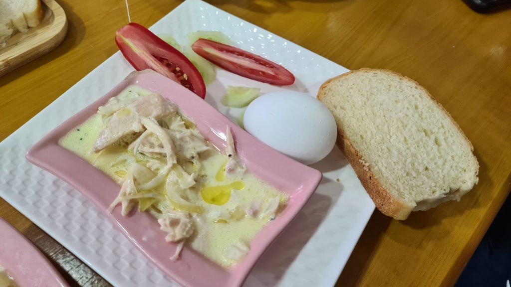 Jakiś kurczak w sosie, 3 plastry ogórka, 2 plasterki pomidora, 1 jajko, chleb, masło i dżem. Ot taki standard szpital+ w Polsce.
