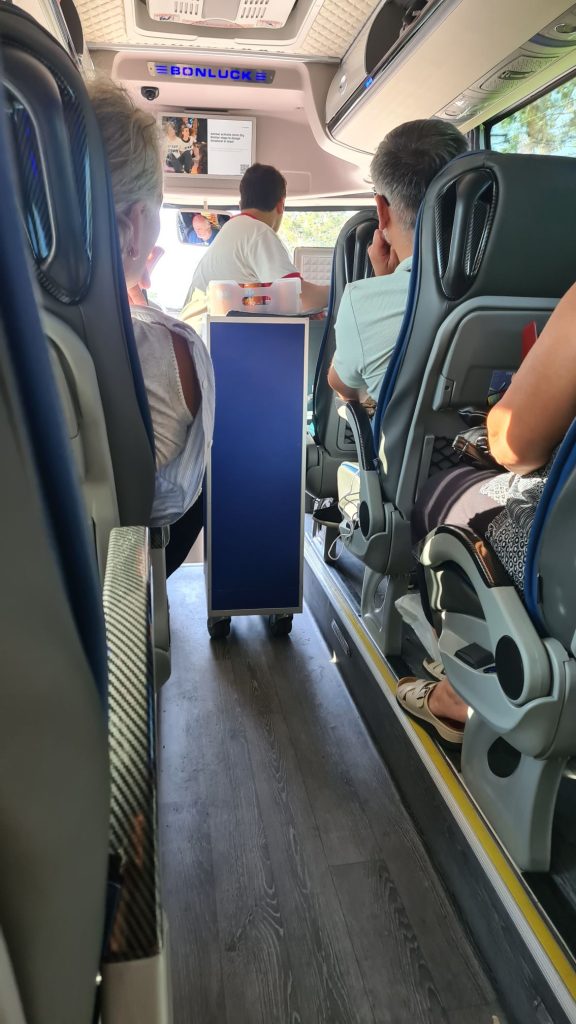 Chwilę po 15 opuściliśmy apartament i Boltem udaliśmy się na dworzec kolejowy znajdujący się na obrzeżach miasta. I jak nazwa nie wskazuje, wsiedliśmy do autobusu firmy Citybus do Tbilisi. Standard autobusu był lepszy, niż w Ryanairze, bo otrzmaliśmy bezpłatnie napitek.