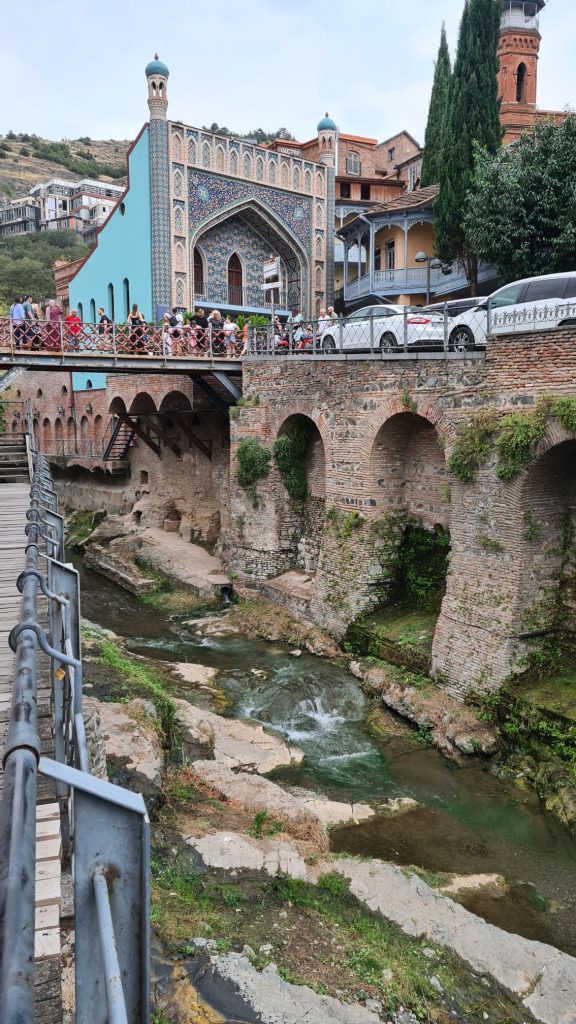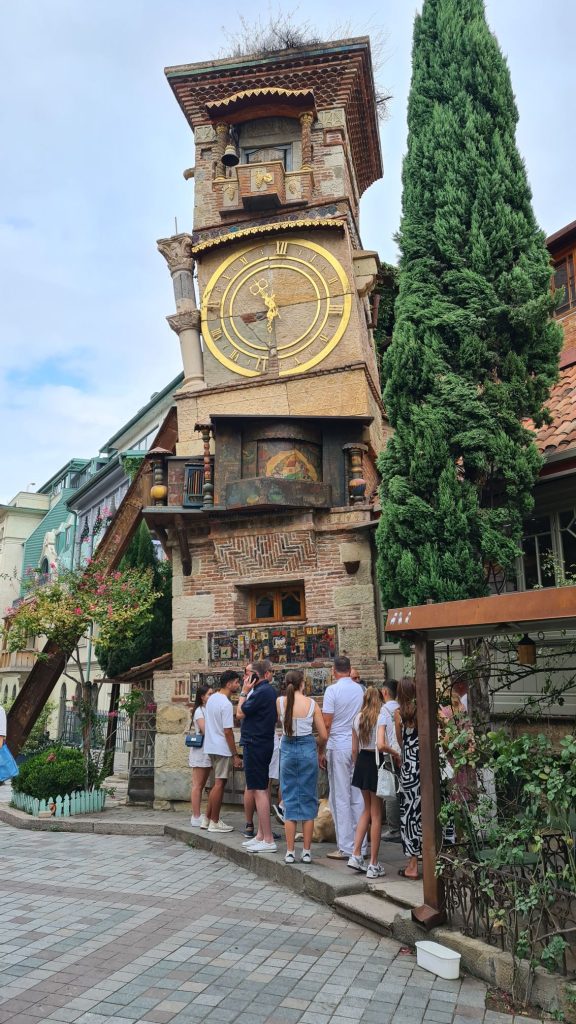 Przewodniczką była młoda Gruzinka, która przybliżała nam kulturę Gruzji i specyfikę miasta Tbilisi. Zaczęliśmy od oryginalnej wieży zegarowej, która stała się niemal symbolem miasta, a ma raptem 15 lat. Wraz z przyległym budynkiem został stworzony przez Gabriadzego i mieści się tam teatr lalek. Na jednej ze scian widnieje mądra sentencja w jezyku łacińskim: