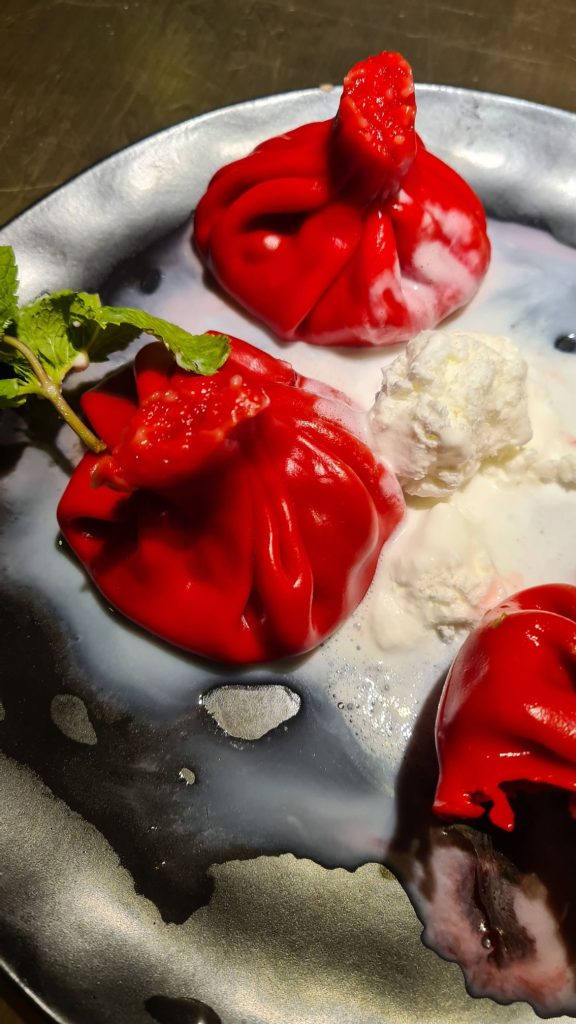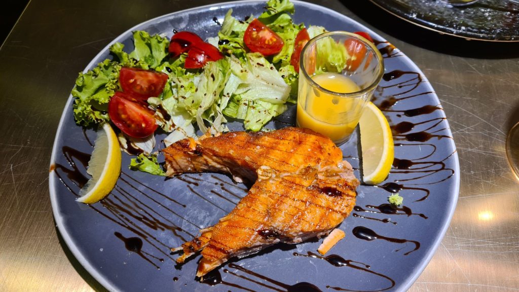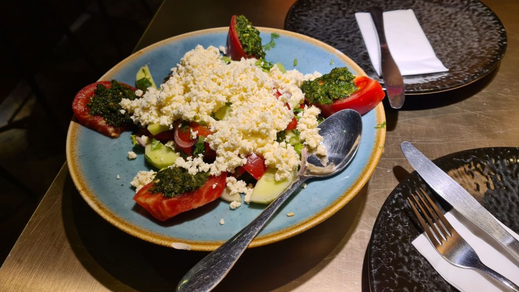 Na późny obiad udaliśmy się do Kinkali Pub. Niby to była restauracja, ale w sumie to w formie pubu. I z bardzo niepasującą, elektroniczną muzyką. Natomiast jedzenie było bardzo dobre: modyfikacja standardowej tutaj sałatki z ogórkiem i pomidorem, łosoś z frytkami, a na deser kinkali na słodko z truskawkami i jagodami w środku.