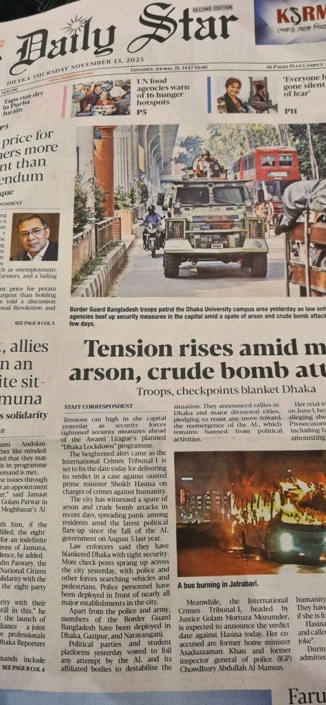 Otóż byłem wczoraj na a-la-dworcu autobusowym. Bylo tam kilkanaście biur różnych firm transportowych. Ale niemal wszystkie napisy były po bengalsku… więc jak tu znaleźć odpowiednią relację? Z pomocą przyszedł Couchsurfing. Choć pierwszy kolega (Sony) się nie zjawił, to drugi (Dolan) niespodziewanie się pojawił i pomógł mi. Busy do Khulna znalazłem, byly miejsca, ale ponoć z niestabilną sytuacją polityczną i możliwymi protestami czy nie wiem, rozruchami, nie powinienem jechać. Biletu nie kupiłem. Zacząłem już układać nowy plan na pozostanie w tym śmierdzącym mieście…