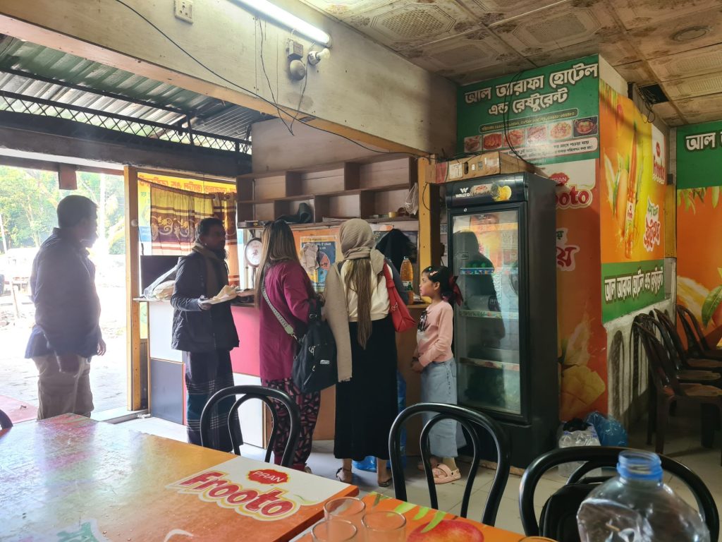 Zatrzymaliśmy się na obiad w jednym z licznych eko-lodge dla turystów, glownie lokalnych. Tu znowu zrobiono mi zdjęcie, aby było reklamą tego miejca w internecie. Po zakończeniu posiłku pojechaliśmy dalej, na lokalny targ. Wypytałem o sprzedawane tam warzywa i owoce. W Bangladeszu nie ma aż tak dużo owoców tropikalnych.