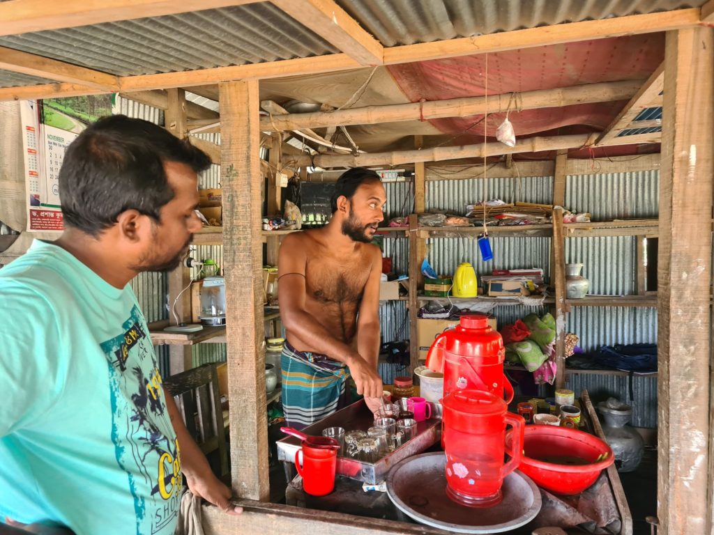 Potem wsiedliśmy znowu do łódki i popłynęliśmy do umówionej w planie wioski. Tu stałem się jeszcze większą atrakcją! Weszliśmy do baaaardzo lokalnej kawiarenki (chyba). Dzieci patrzyły na mnie, jak na święty obrazek. Stały i się po prostu gapiły. Starsi standardowo: „country?”. Potem zagadywali coś więcej, ale w bengala, więc przewodnik tłumaczył.