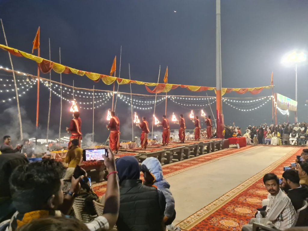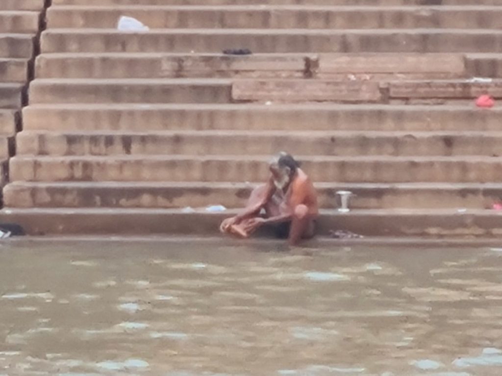 Dzień rozpocząłem o 4:45. Po 5 zaczęła się klasyczna tutaj wycieczka łódką przed wschodem słońca. Popłynęliśmy najpierw Gangesem na południe do Assi Ghat na ceremonię chyba taką samą, jak wczorajsza wieczorem, tylko w innym miejscu. Bramini wykonywali w każdym razie te same czynności.